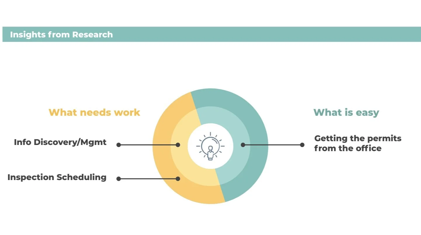 Permitting was chosen out of relevance with COVID-19. After digging in, it was really clear to see that homeowners don’t have an easy way to find the information they need quickly regarding permitting and inspections. Understanding that led us to focus on the beginning and end, while leaving the middle piece untouched.